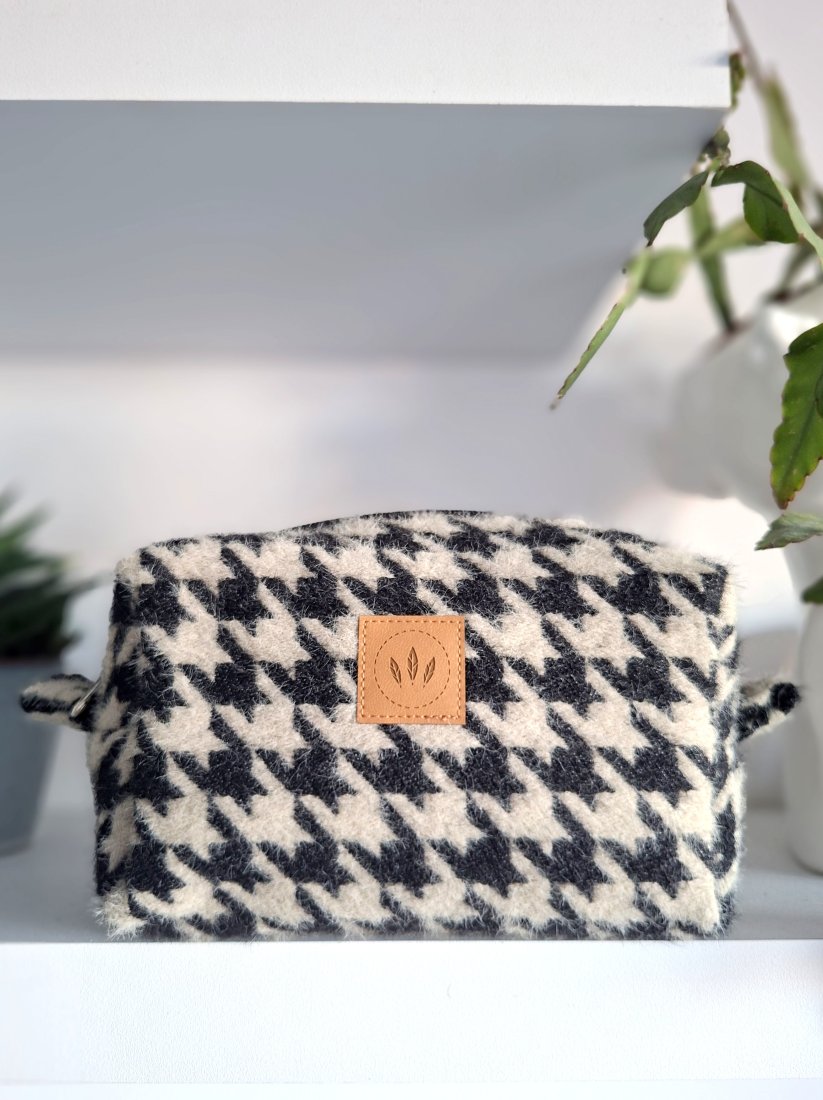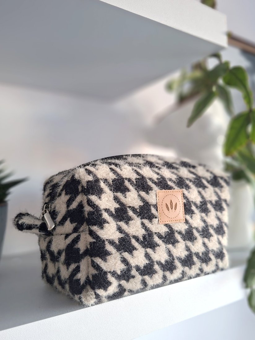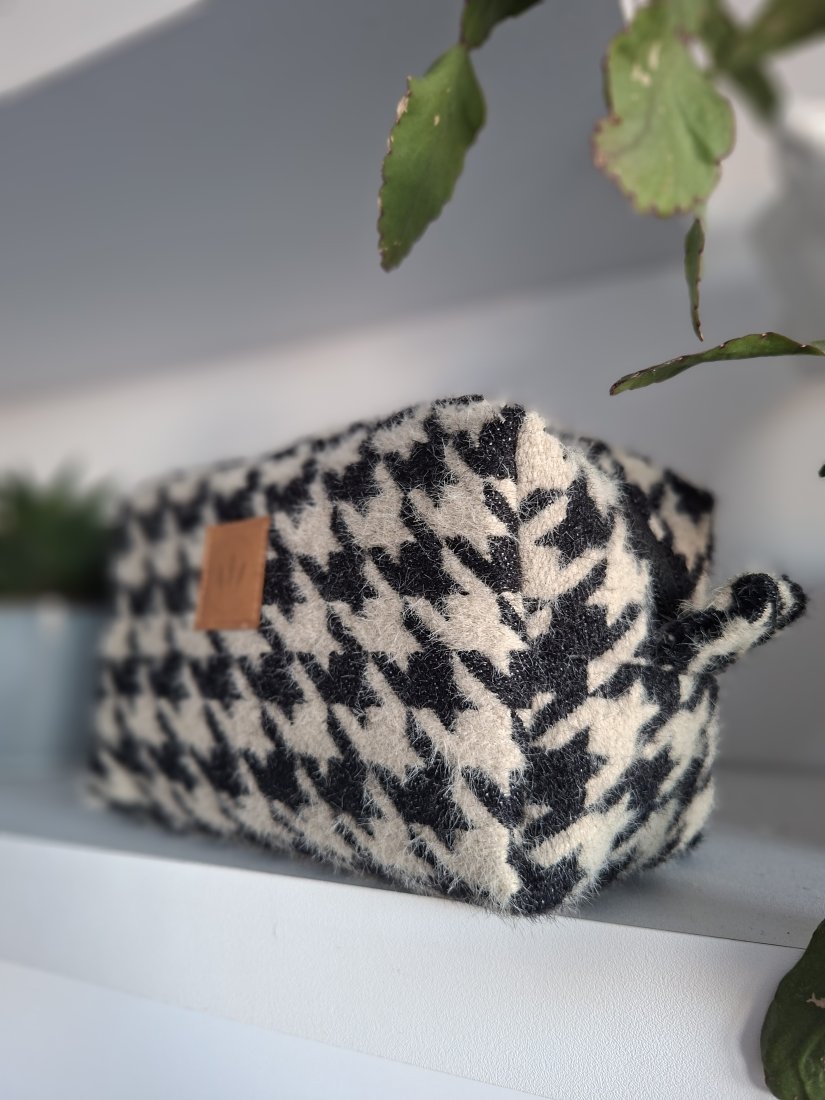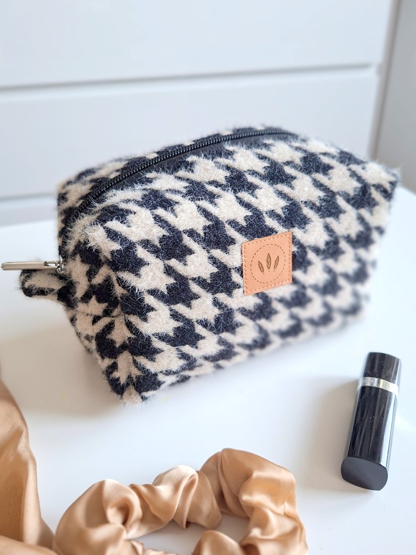 Średniej wielkości kosmetyczka z fantazyjnej tkaniny o puchatej fakturze.