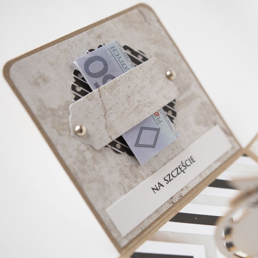 Na środku pudełeczka znajduje się dekoracja z papierowymi kwiatuszkami, na ściankach życzenia dla solenizanta, miejsce na podpis oraz miejsce na banknoty