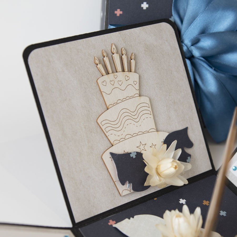 Na środku pudełeczka znajduje się dekoracja z papierowymi kwiatuszkami, na ściankach życzenia dla solenizanta, miejsce na podpis oraz miejsce na banknoty