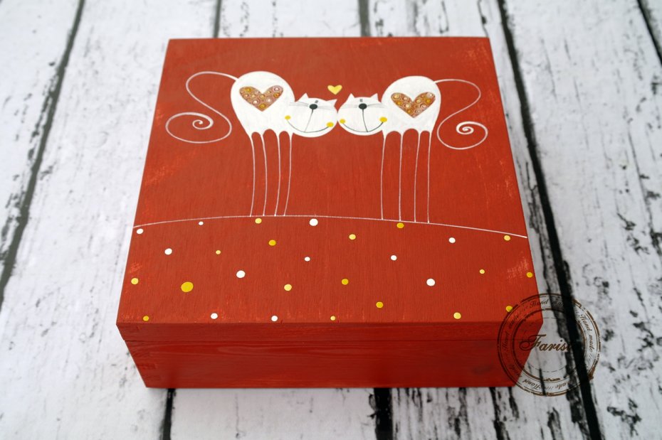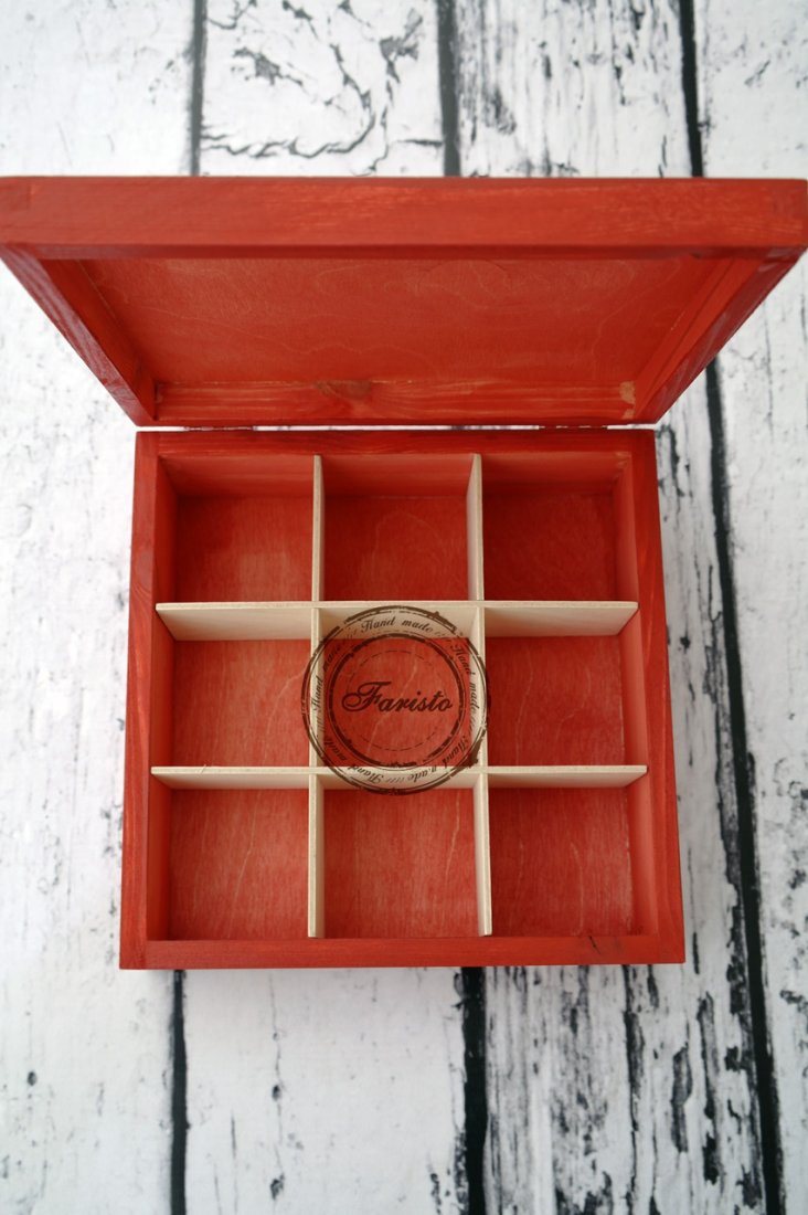 Ręcznie malowane farbami akrylowymi (ekologicznymi) drewniane pudełko z 9 przegródkami, które można wyjmować. Pudełko można przecierać mokrą ściereczką. Istnieje możliwość personalizacji pudełka.