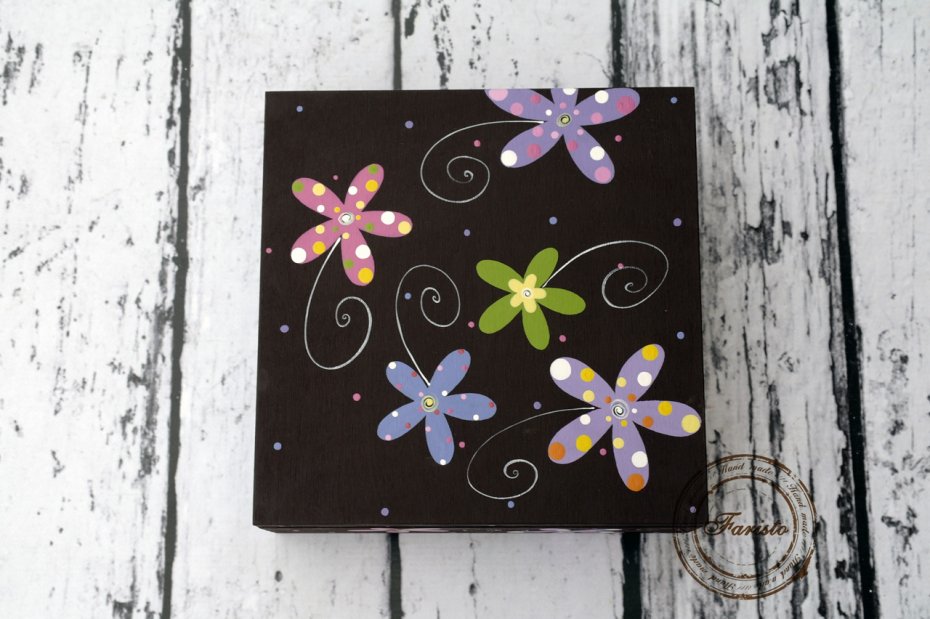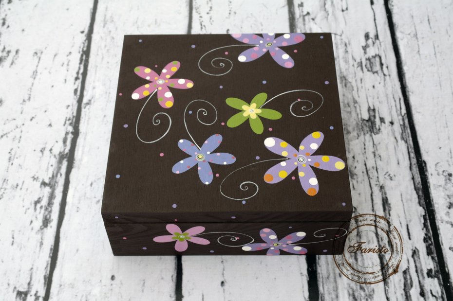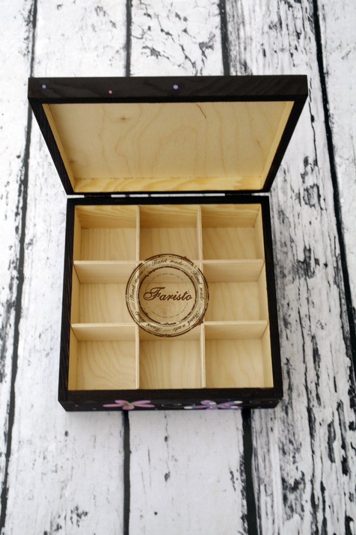 Ręcznie malowane farbami akrylowymi (ekologicznymi) drewniane pudełko z 9 przegródkami, które można wyjmować. Pudełko można przecierać mokrą ściereczką. Istnieje możliwość personalizacji pudełka.