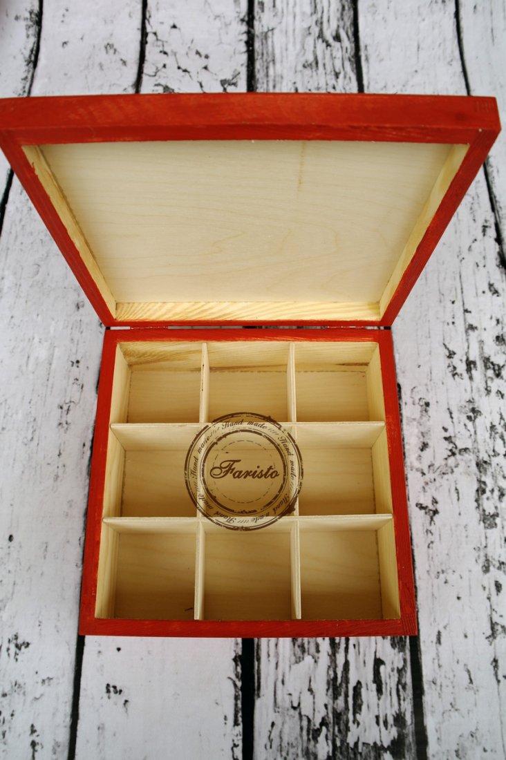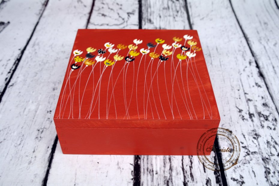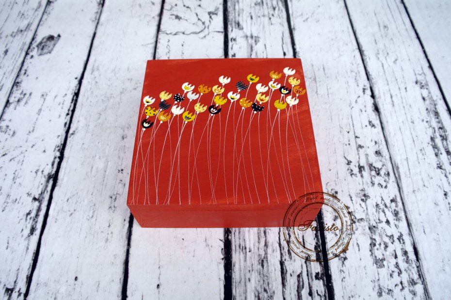 Ręcznie malowane farbami akrylowymi (ekologicznymi) drewniane pudełko z 9 przegródkami, które można wyjmować. Pudełko można przecierać mokrą ściereczką. Istnieje możliwość personalizacji pudełka.