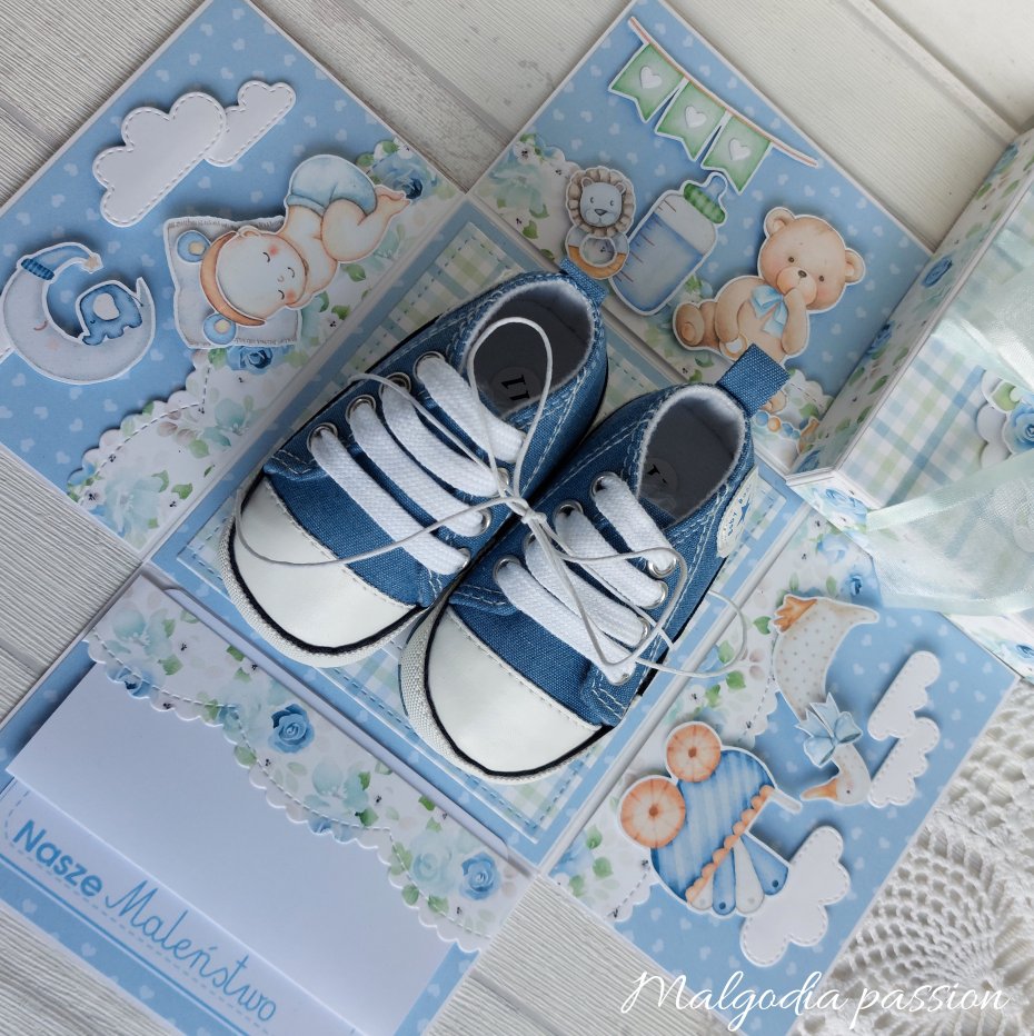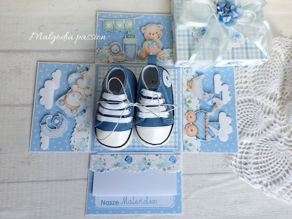 Jedyne w swoim rodzaju duże pudełko expoding box z prawdziwymi bucikami, niepowtarzalna pamiątka na narodziny maluszka.