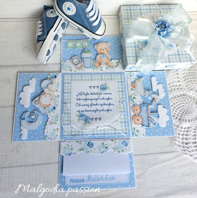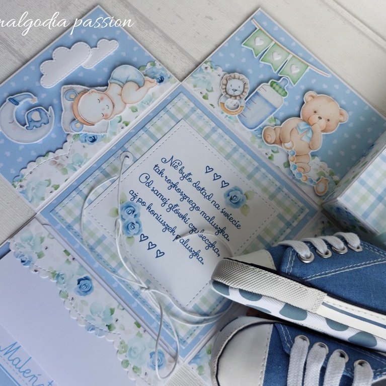 Wykonane z największą starannością z wysokiej jakości materiałów papierniczych. Wewnątrz umieszczone prawdziwe buciki - trampeczki nr. 11 w kolorze niebieskiego dżinsu .Ozdobione trójwymiarowymi elementami, a w środku uroczym wierszykiem. Na jednej ze ścianek wyjmowana kartka z życzeniami, metryczka do wypełnienia i koperta na pieniądze.