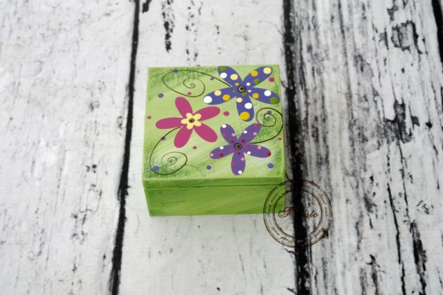 Ręcznie malowane farbami akrylowymi (ekologicznymi) drewniane pudełeczko mini na różne skarby. Pudełko można przecierać mokrą ściereczką. Istnieje możliwość personalizacji pudełka.