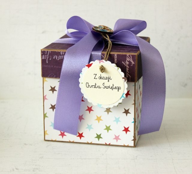 Pudełko na chrzest lub roczek. Po otworzeniu ścianki pudełka rozkładają się, a na każdej z nich, za obrazkiem, znajduje się kieszonka, do której można włożyć pieniążki lub bony do sklepu. Dodatkowo można w nim ukryć drobny upominek, np. buciki lub smoczek. Na dnie wpisane zostały piękne życzenia.