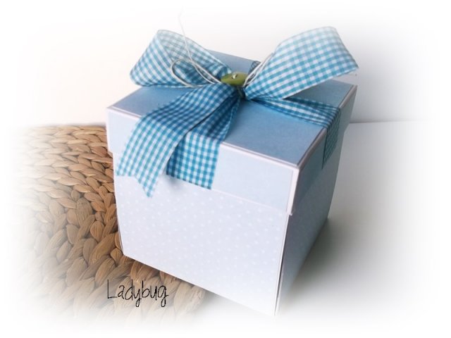 Oryginalna forma - po podniesieniu wieczka ścianki pudełka otwierają się prezentując urocze elementy samochodziku, konika na biegunach, wózeczka itp. Na ściankach jest miejsce na wsunięcie kuponu lotto lub gotówki. Na denku karteczka na życzenia.