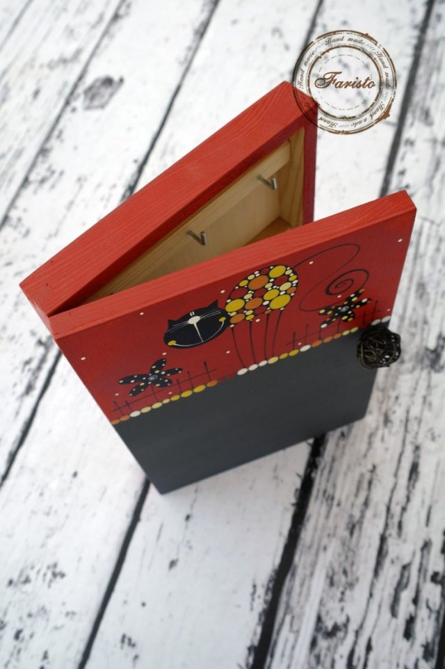 Ręcznie malowane farbami akrylowymi (ekologicznymi), odpornymi na wodę drewniane pudełko na klucze. Pudełko wiszące, otwierane, posiada w środku 9 wieszaczków na klucze, albo inne drobiazgi.