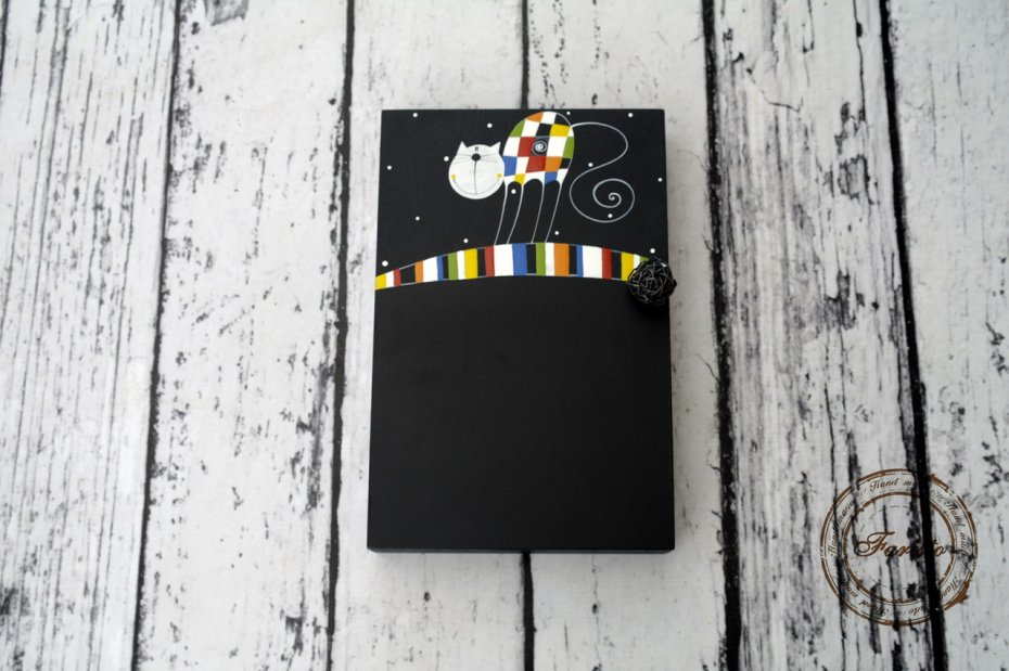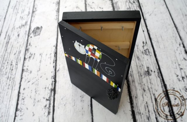 Ręcznie malowane farbami akrylowymi (ekologicznymi), odpornymi na wodę drewniane pudełko na klucze. Pudełko wiszące, otwierane, posiada w środku 9 wieszaczków na klucze, albo inne drobiazgi.