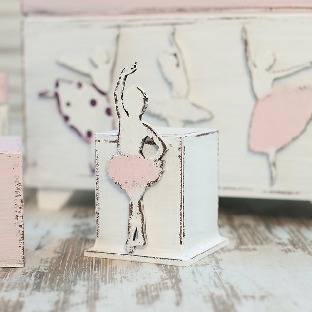 Drewniane pudełko na ołówki ozdobione roztańczoną baletnica w różowej spódnicy