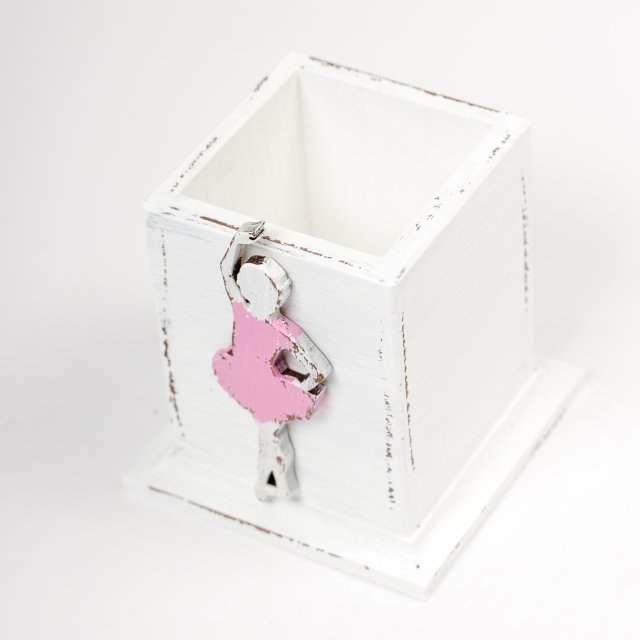 Drewniane pudełko na ołówki ozdobione roztańczoną baletnica