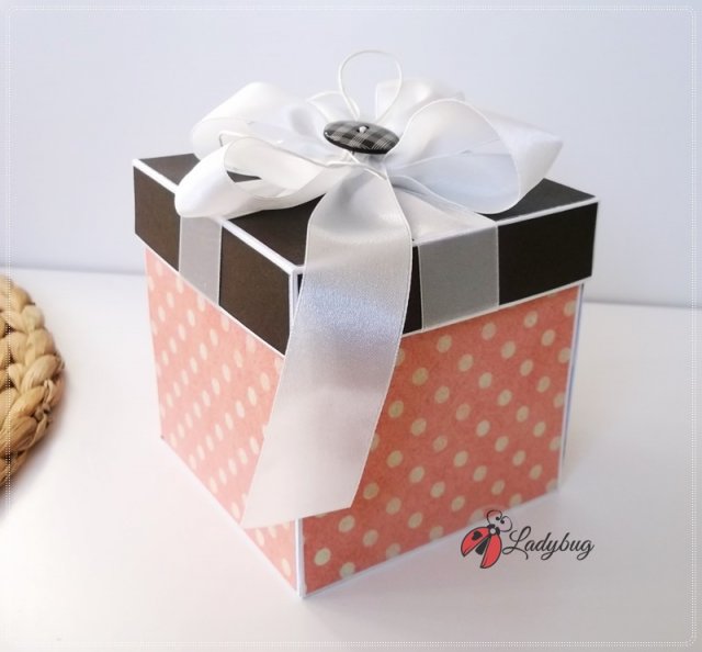 Możliwość dodania etykietki z imionami pary młodej i datą ślubu, napisów na zewnątrz pudełka jak również wykonania pudełka w innej kolorystyce.złożone pudełko 10x10x10 cm