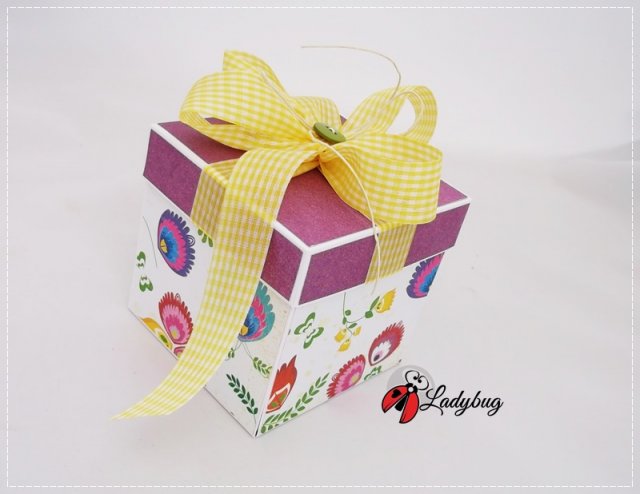 Możliwość dodania etykietki z imionami pary młodej i datą ślubu, napisów na zewnątrz pudełka jak również wykonania pudełka w innej kolorystyce.złożone pudełko 10x10x10 cm