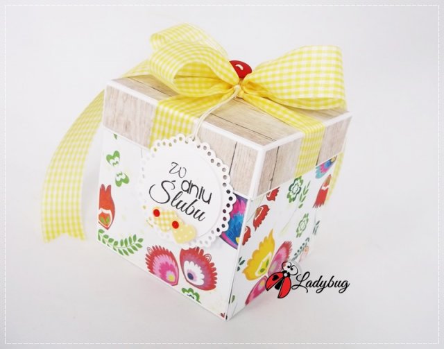 Możliwość dodania etykietki z imionami pary młodej i datą ślubu, napisów na zewnątrz pudełka jak również wykonania pudełka w innej kolorystyce.złożone pudełko 10x10x10 cm