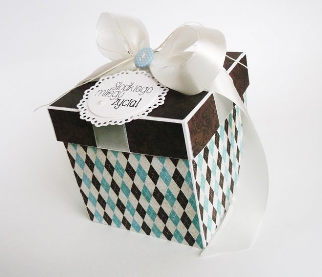 Unikatowe pudełko w połączeniu koloru turkusowego z brązem, przeplecione błękitami i kremem- oryginalny sposób na przekazanie życzeń oraz gotówki Młodej Parze. Pudełko po podniesieniu wieczka rozkłada swoje cztery ścianki, na których znajdują się kieszonki (na gotówkę lub kupony lotto). Każda kieszonka ozdobiona jest zabawnym motywem z propozycja wydania gotówki np. na autko, na bociana, na podróże itp.