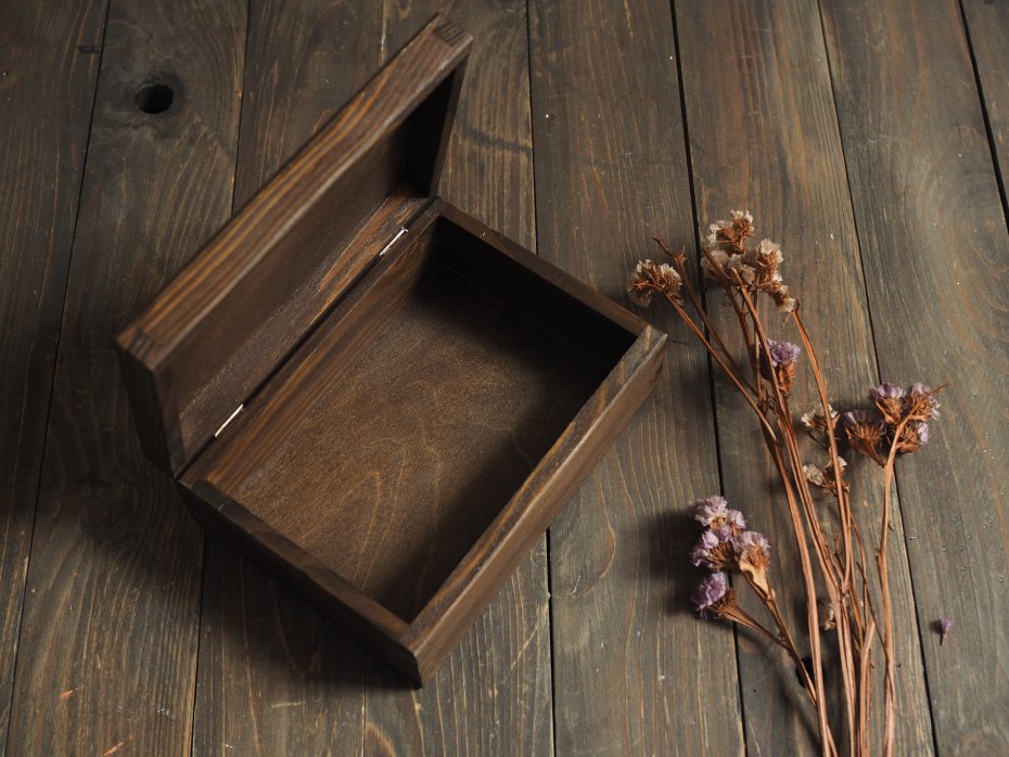 Materiał z którego zostało wykonane pudełko: lite drewno sosnowe (ścianki) i sklejka brzozowa (góra wieczka i spód pudełka), używam bardzo dobrej jakości polskiego drewna.