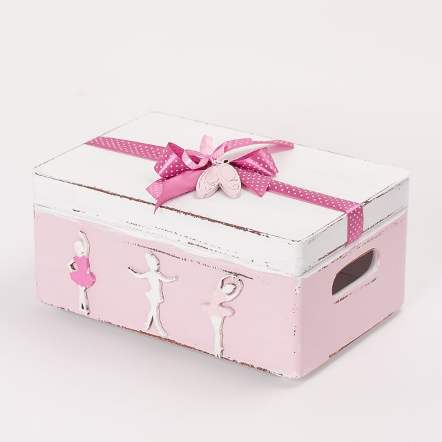 Zamykane drewniane pudełko pomalowane metodą shabby chic, ozdobione roztańczonymi baletnicami w delikatnym różu: Skarby. Można w nim ukryć wiele drobiazgów, zdjęć, pamiątek...