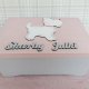 Elementem dekoracyjnym jest biały piesek i napis Skarby Zuzi. Oczywiście w tym miejscu napiszemy każde wskazane w uwagach przez Ciebie imię.