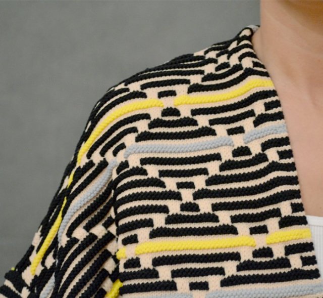 Cudo sweter o geometrycznym, pudełkowym fasonie. Etniczny wzór o wypukłej fakturze. Sztywniejszy. Polecam bardzo.