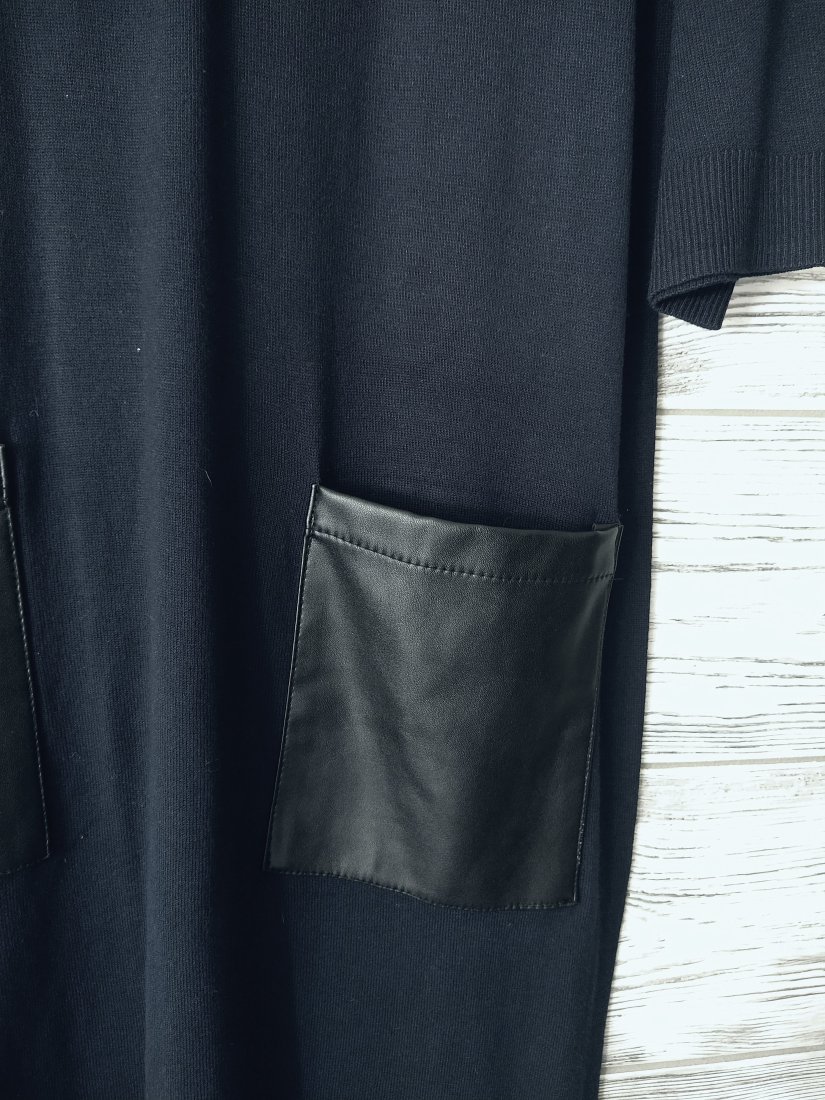 Granatowa prosta sukienka z dużymi kieszeniami ze skóry ekologicznej.