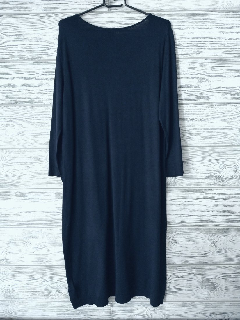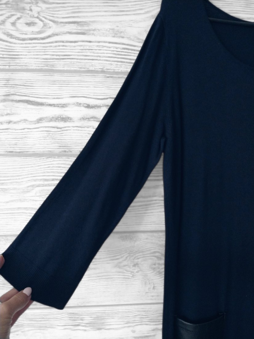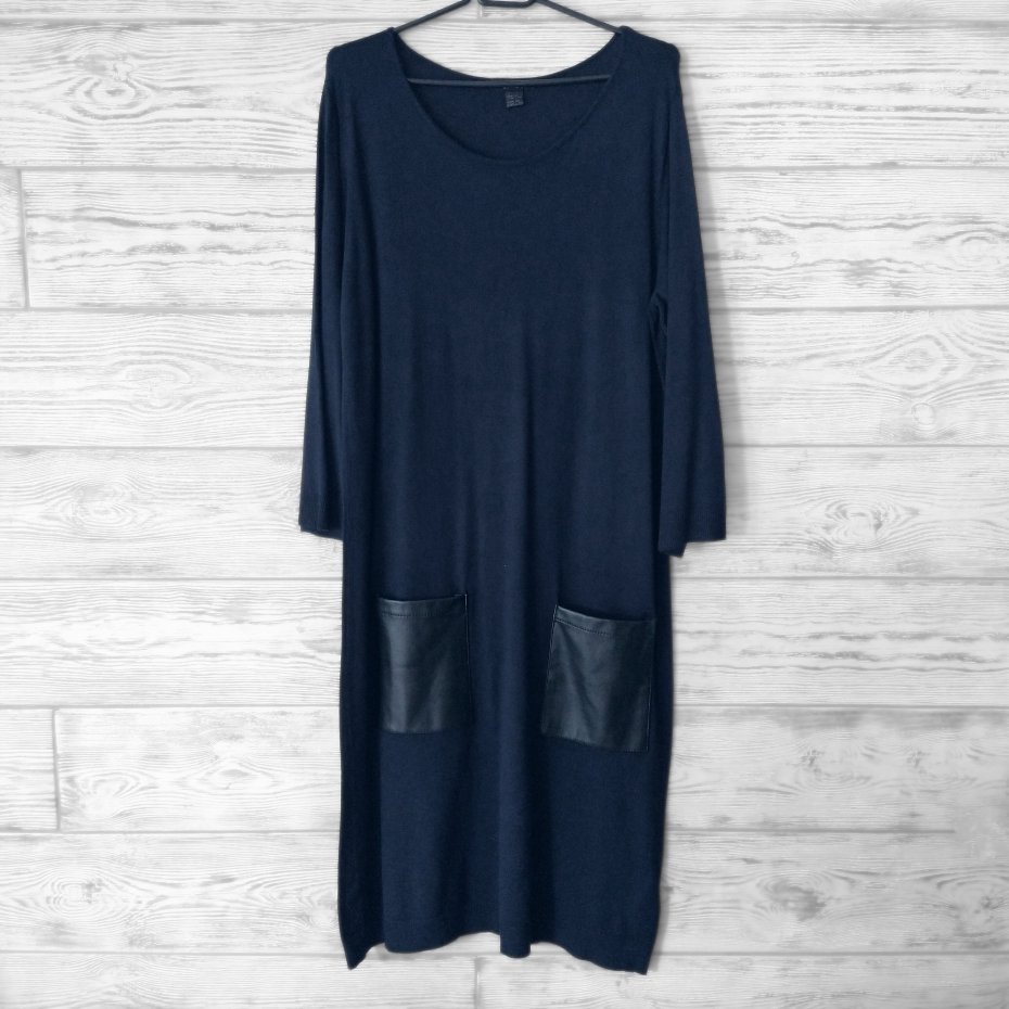 Granatowa prosta sukienka z dużymi kieszeniami ze skóry ekologicznej.
