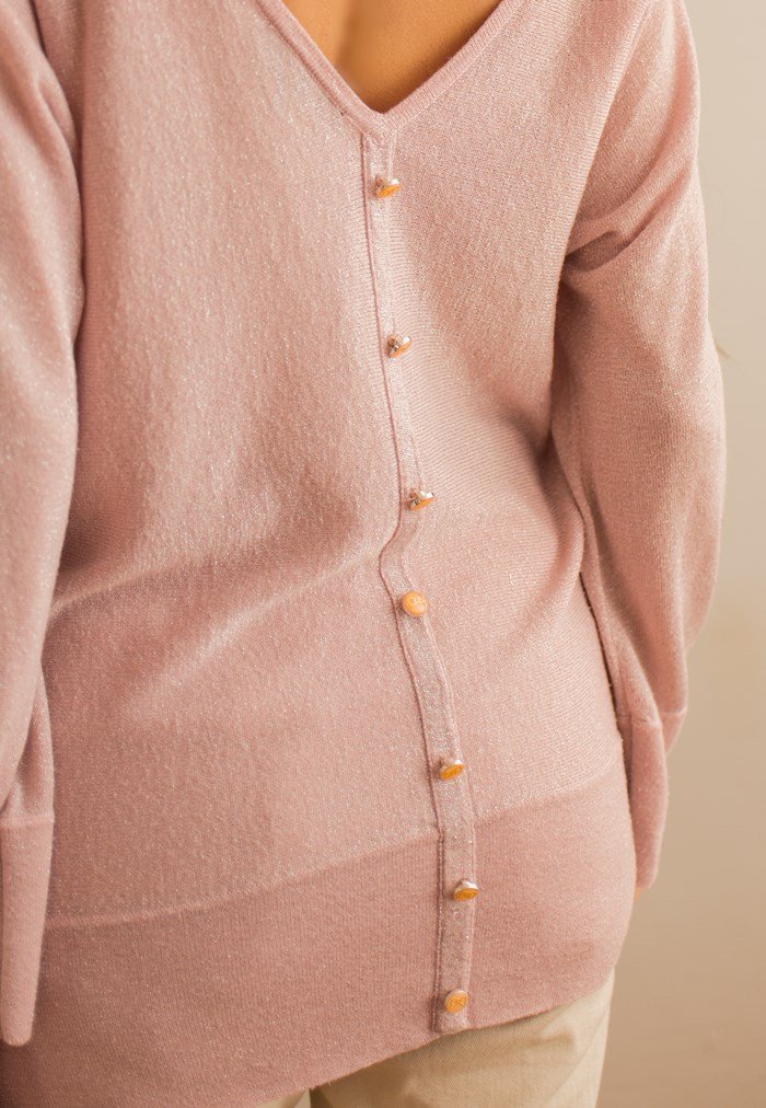 Pudrowa bluzka z błyszczącą nitką. Na plecach posiada ozdobne guziki.