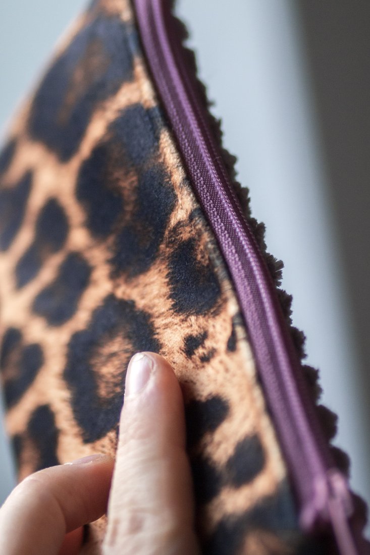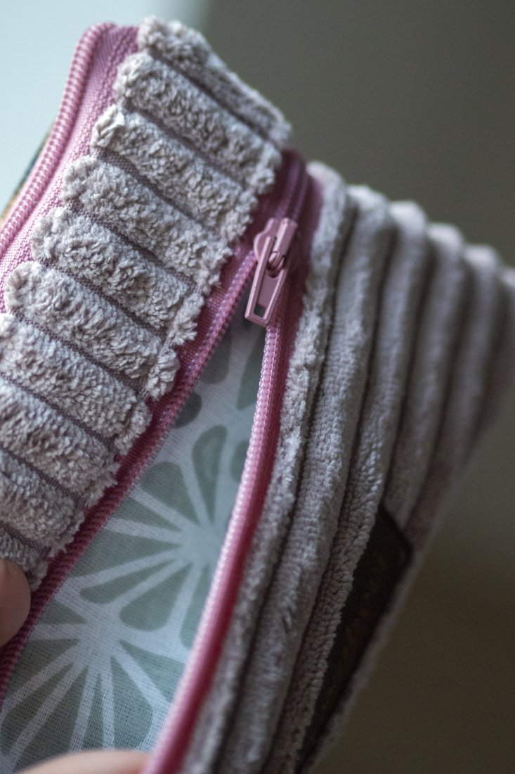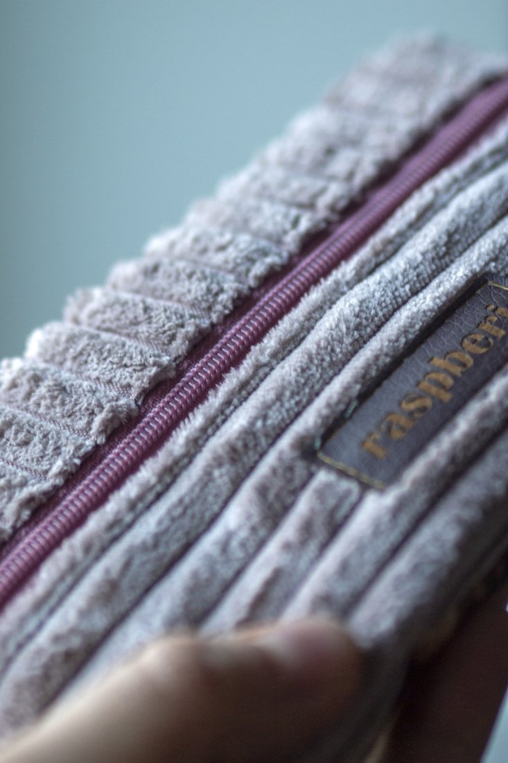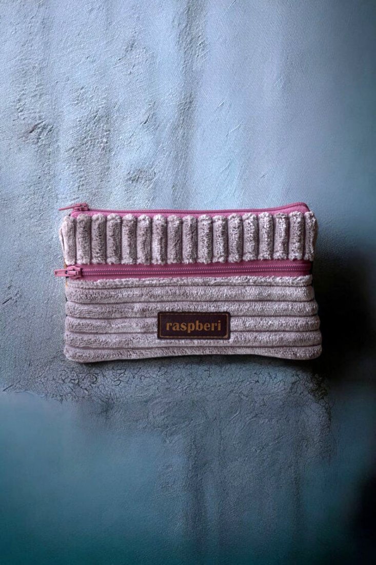Prosty wodoodporny portfel wykonany z grubego pudroworóżowego sztruksu oraz weluru w panterkę.