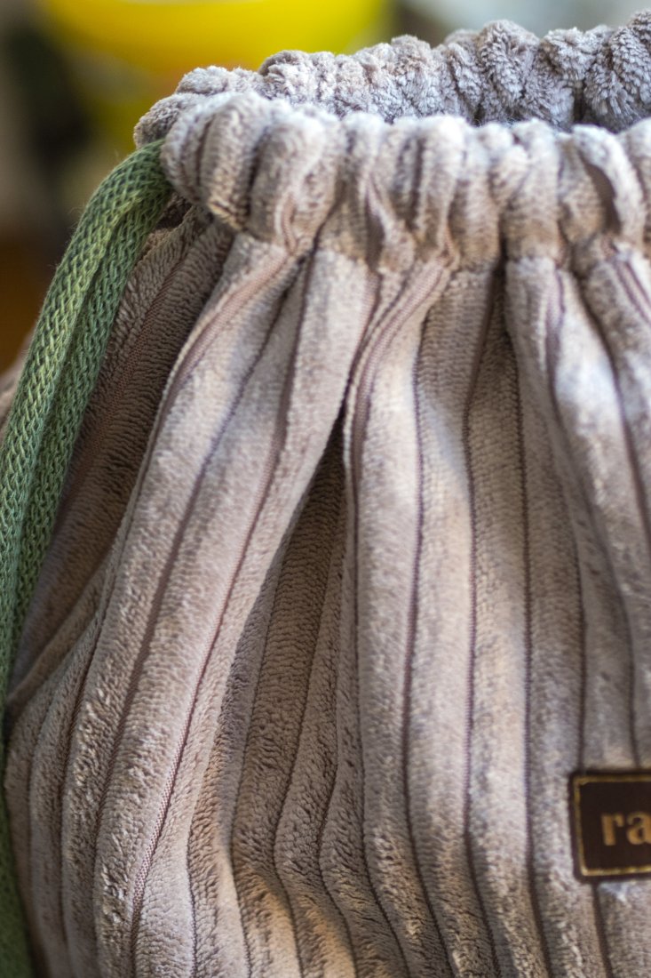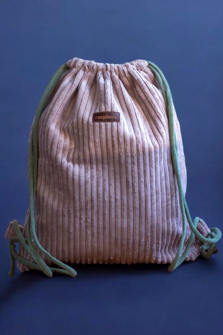 Plecak worek w kolorze pudroworóżowym wykonany z grubego sztruksu.