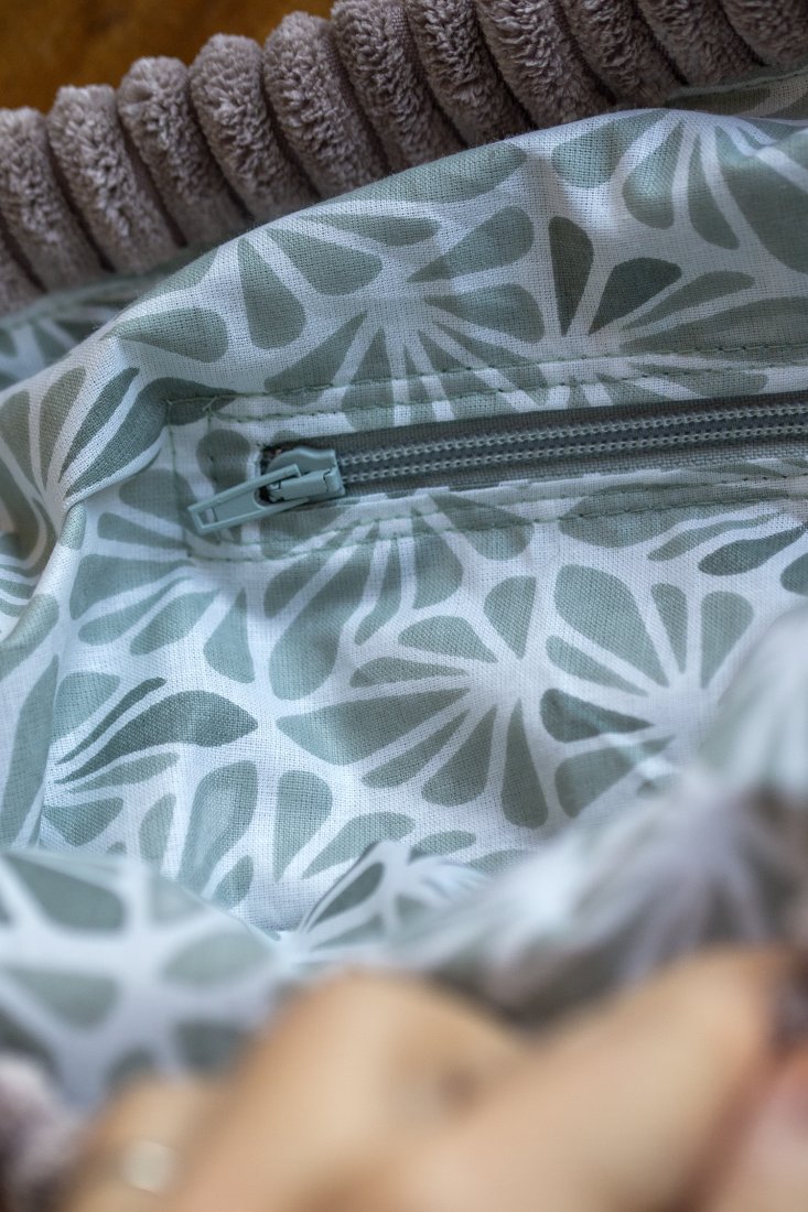 Wzorzysta bawełniana podszewka. Kieszonka w środku.
