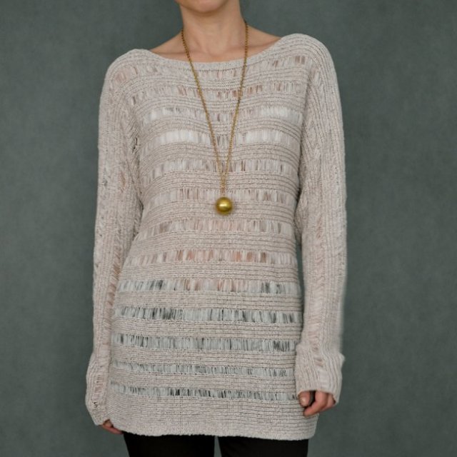 Pudrowy sweter ze sznurkowej dzianiny. Naprzemiennie pleciony i przekładany pajęczynką. Ma dość długie rękawy.