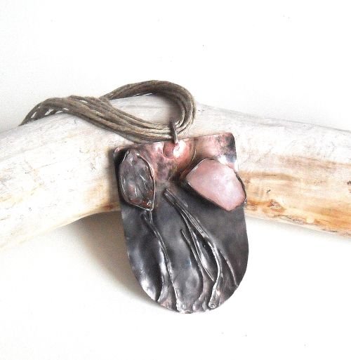 Wisior mojego autorstwa z kamieniami surowego kwarcu i ametystu.Miedz,patynowana na stare srebro i złoto cyna,kamienie,sznur lniany lub długi łańcuszek według życzenia. Wymiary 8,5 na 5cm.