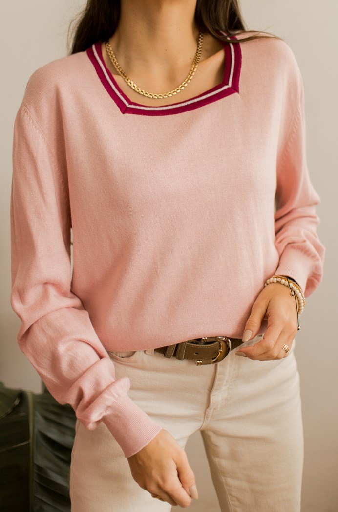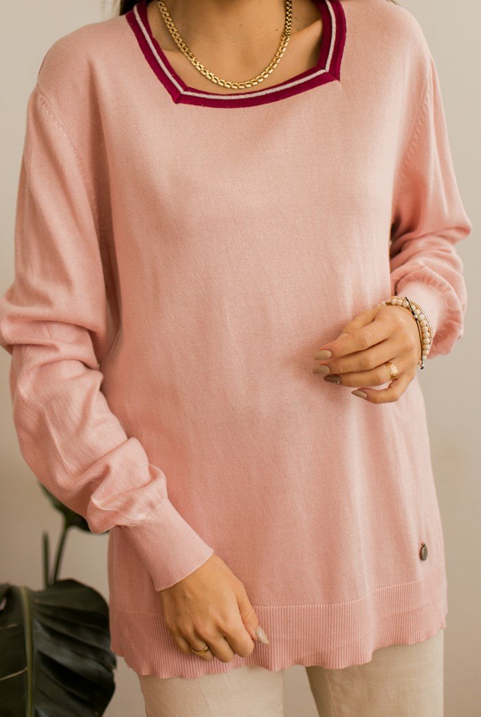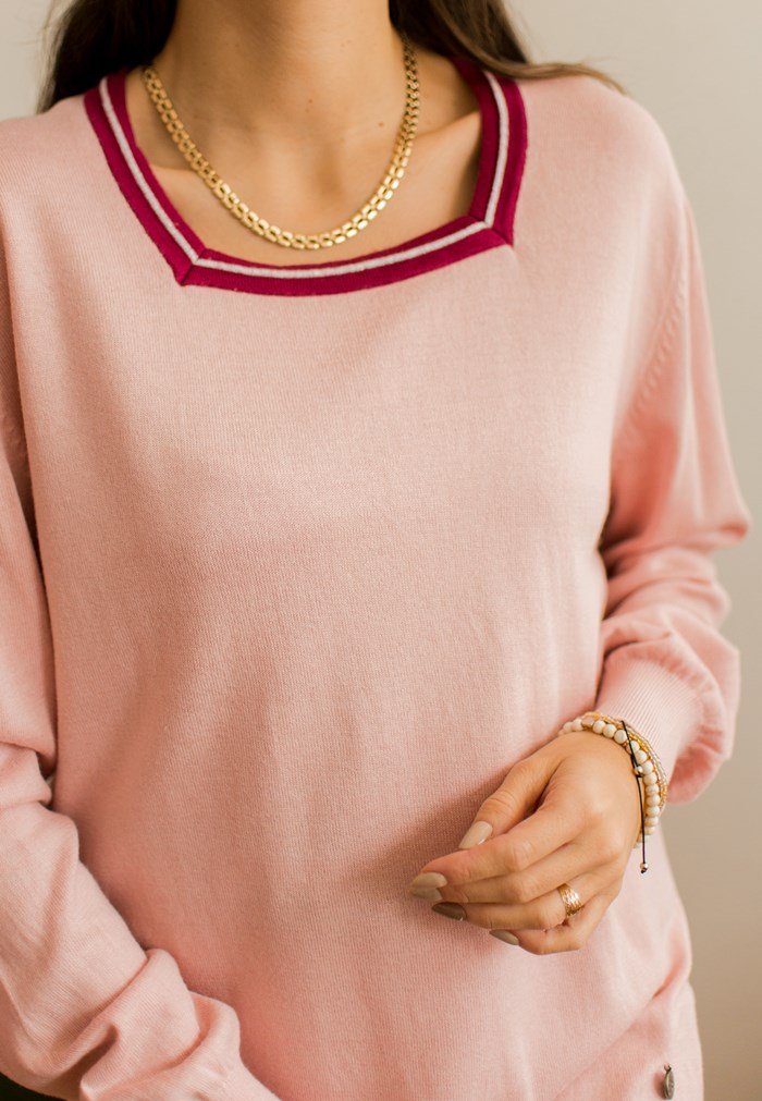 Cienki pudrowy sweterek z fuksjową lamówką.