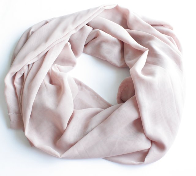 Zwiewny, duży szal w pudrowym chłodnym odcieniu różu. Szal jest dwuwarstwowy. Wykonany prawdopodobnie z poliestru.