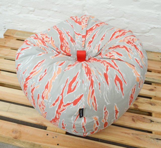 Pufa z drelichu bawełnianego z nadrukiem. Wzór płomieni na szarym tle pasuje do pokoju szalonego chłopaka a zarazem może być idealnym prezentem dla osoby kochającej niekonwencjonalne motywy. Pufa jest wykonana z podwójnej tkaniny co zwiększa jej wytrzymałość. Spód z białej ekologicznej skóry zapinany na zamek. Uchwyt u góry z czerwonej taśmy parcianej. Na spodzie dodatkowa rączka ułatwiająca przenoszenie lub przechowywanie. Wypełnienie wyjmowane w poszewce.