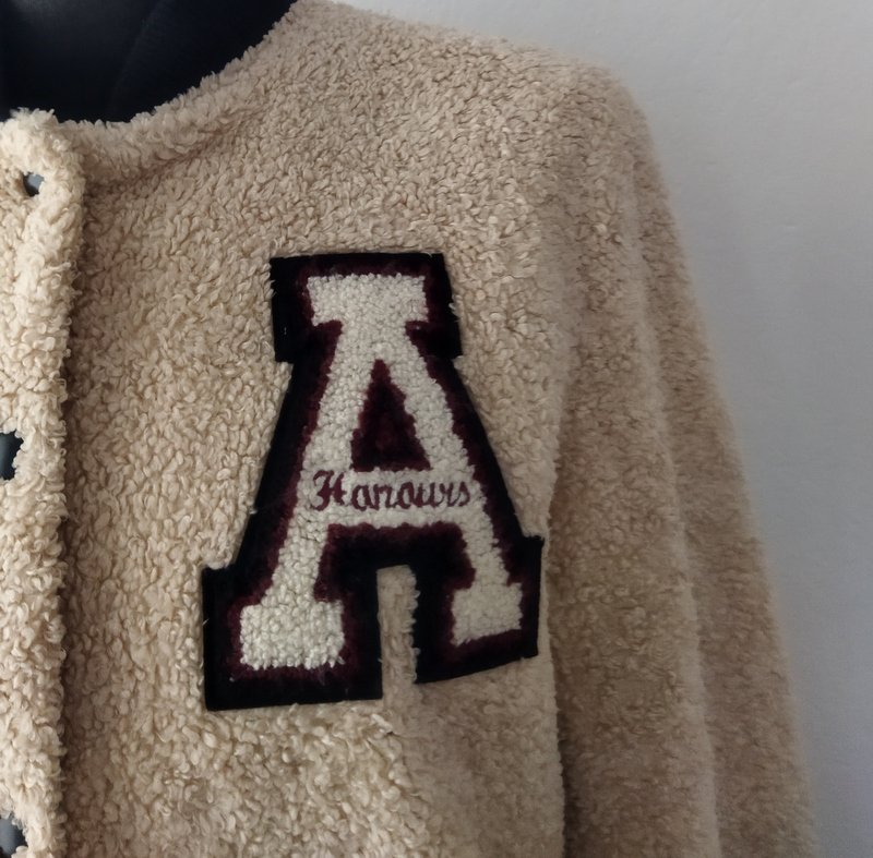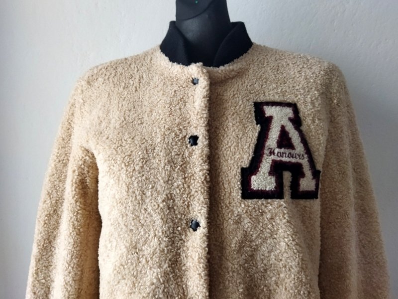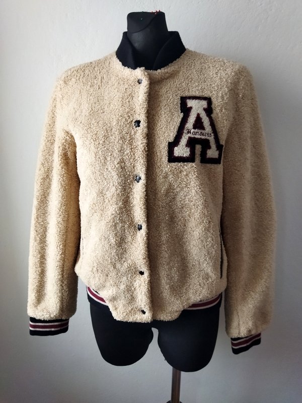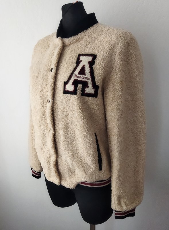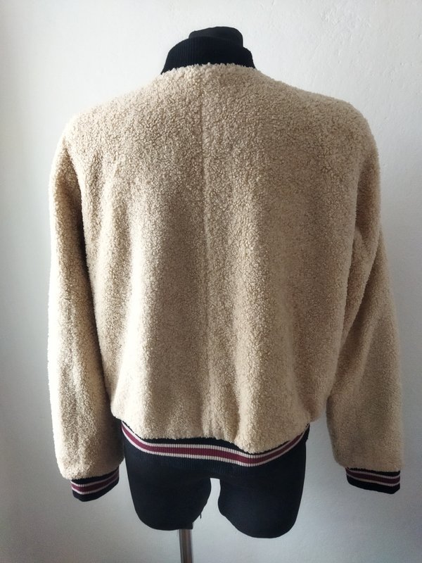 Kurtka typu bomber ze sztucznego futerka a' la baranek w piaskowym kolorze wpadającym w lekki jasny bez. Wykończona dzianinowymi czarnymi ściągaczami w beżowo- bordowe paski, w tych samych kolorach naszywana aplikacja. Pod szyją ściągaczowa plisa cała czarna. Zapinana na napowe guziki. U dołu dwie wpuszczane kieszenie z lamówkami z czarnej skóry ekologicznej. Całość na pikowanej lekko ocieplanej podszewce.