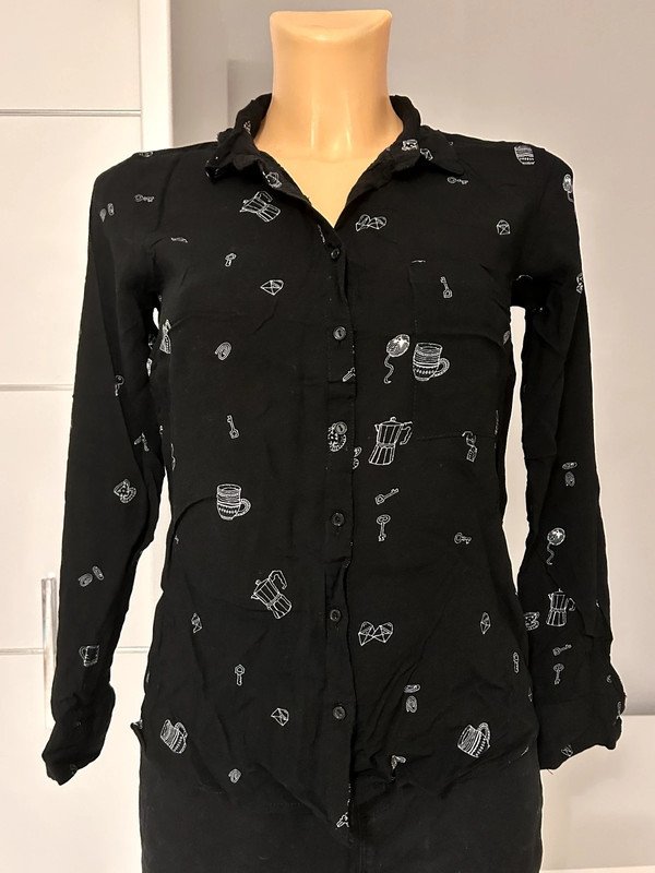 Koszula marki Pull&Bear, rozmiar z metki to S 36. Jest zapinana na guziki, posiada urocze nadruki. Jest wykonana w 100% z wiskozy. Posiada zapasowy guzik.