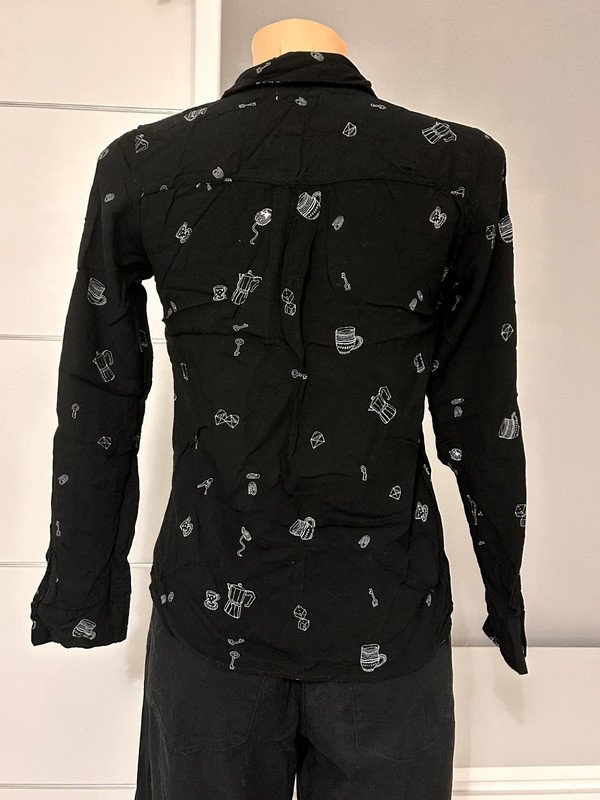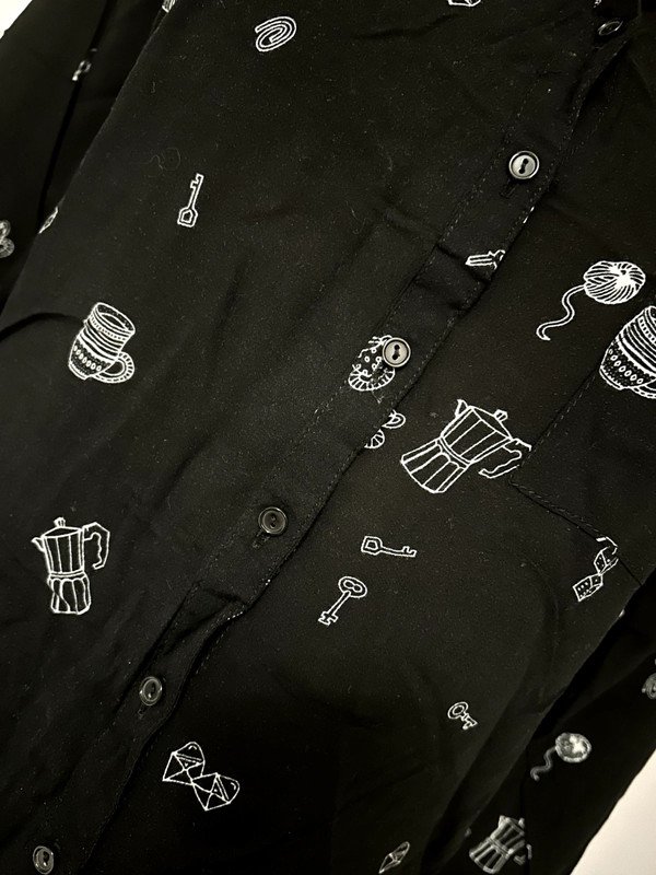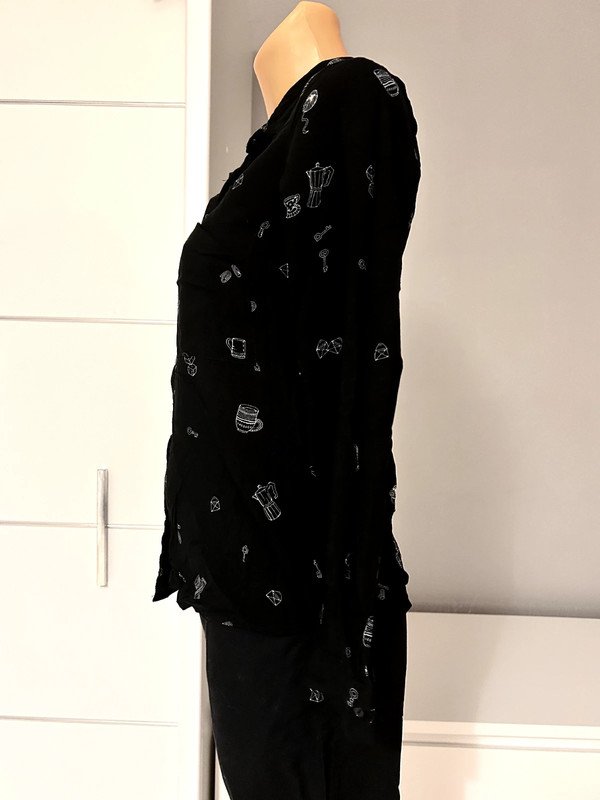 Koszula marki Pull&Bear, rozmiar z metki to S 36. Jest zapinana na guziki, posiada urocze nadruki. Jest wykonana w 100% z wiskozy. Posiada zapasowy guzik.