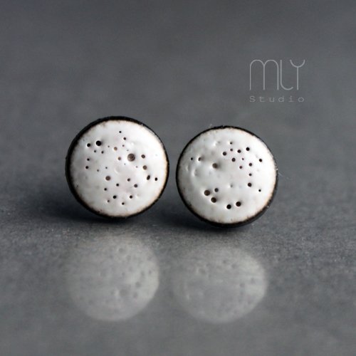 Efektowne kolczyki w formie sztyftów, ręcznie wykonane z delikatnej czekoladowobrązowej gliny kamionkowej, jednostronnie szkliwione efektownym subtelnie błyszczącym biało beżowym szkliwem, na posrebrzanych sztyftach.Średnica ok. 11mm. Polecam