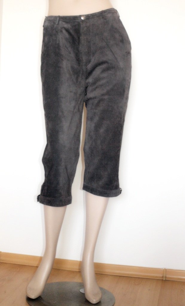 Spodnie z naturalnej skóry zamszowej w kolorze ciemnego brązu. Marka Sondre. Z przodu dwie płytkie zakładki, wyższy stan. Na dole, nogawki zebrane mankietem z klamerką. Skóra bardzo miękka, lekka, w stanie bardzo dobrym, myślę, że nie były używane. Rozmiar z metki 12. Podaję wymiary mierzone na płasko;