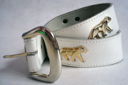 Pasek uszyty z grubej skóry pomalowanej na biało. Pozłacana duża -metalowa klamra.Na pasku przyczepione pozłacane-metalowe postacie pum.