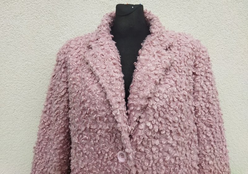 Kurtka ze sztucznego futerka typu baranek w ładnym odcieniu zgaszonego różu. Z kołnierzem z rewersami , z dwiema wpuszczanymi kieszeniami . zapinana na guziki. całość na ocieplanej pikowanej podszewce.