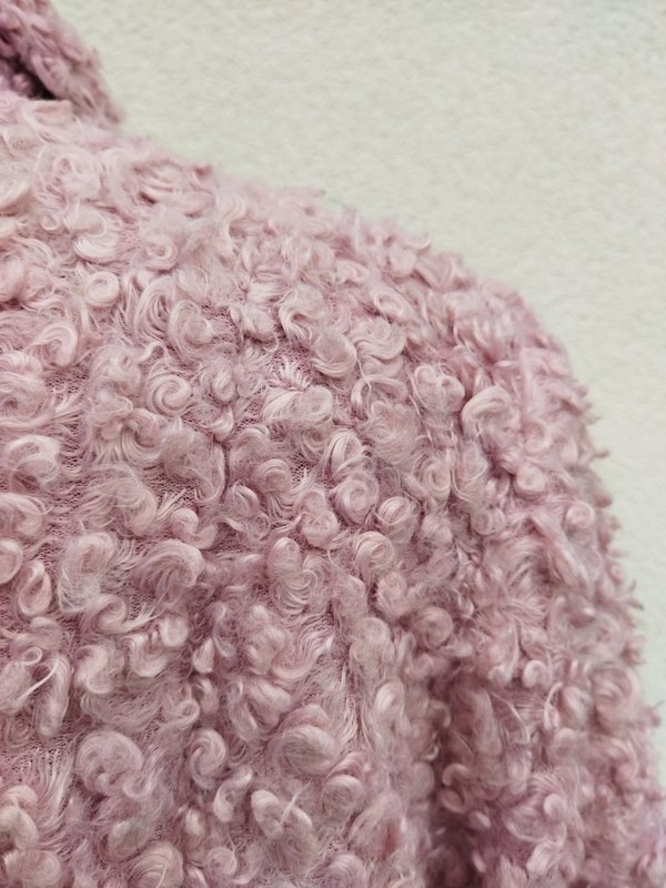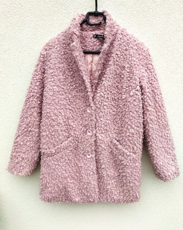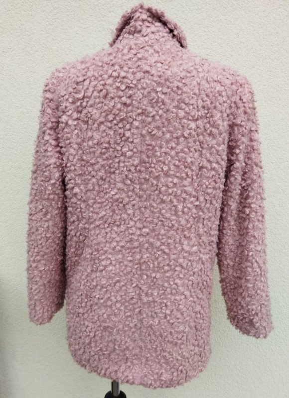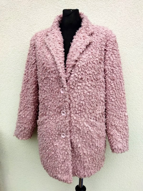 Kurtka ze sztucznego futerka typu baranek w ładnym odcieniu zgaszonego różu. Z kołnierzem z rewersami , z dwiema wpuszczanymi kieszeniami . zapinana na guziki. całość na ocieplanej pikowanej podszewce.