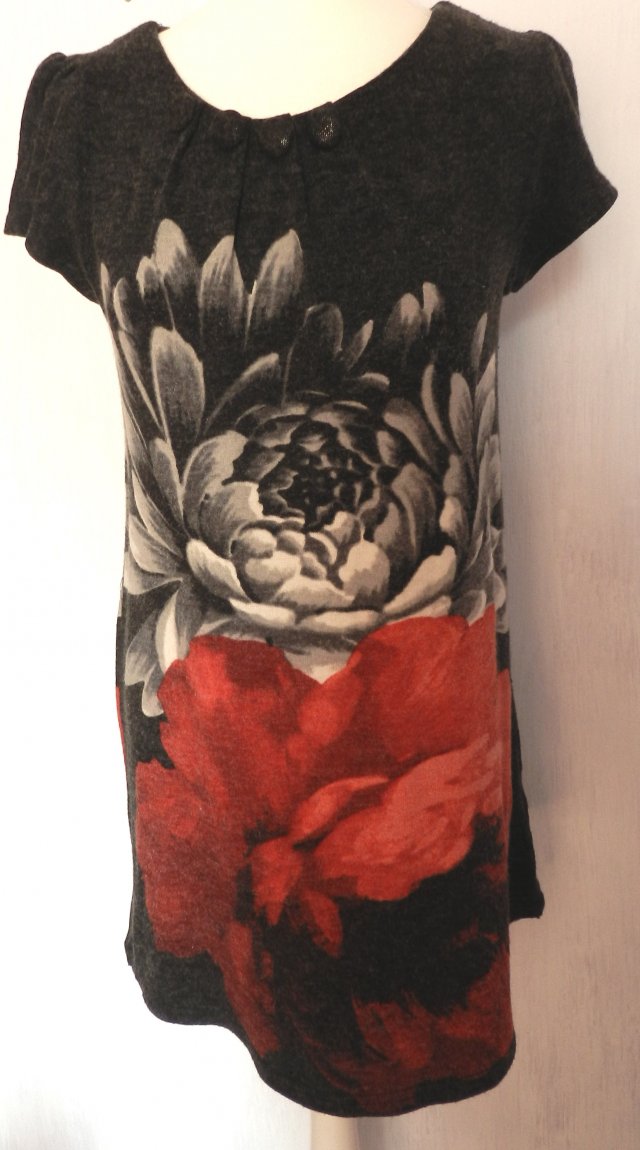 Sukienka / tunika z motywem dwóch kwiatów z przodu i z tyłu - czerwonego i białego na ciemno szarym tle