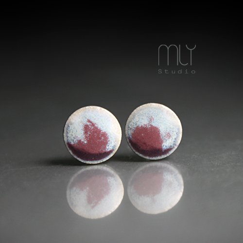 Ceramiczne, lekko nieregularne kolczyki w formie sztyftów, ręcznie wykonane z delikatnej gliny kamionkowej, jednostronnie szkliwione efektowną mieszanką białokremowych i fioletowych szkliw z efektem plamek, na antyalergicznych sztyftach w kolorze srebrnym.Średnica ok.9mm. Polecam
