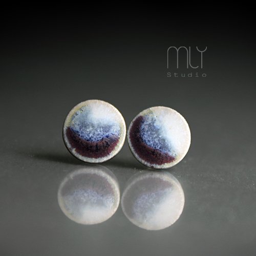 Ceramiczne, lekko nieregularne kolczyki w formie sztyftów, ręcznie wykonane z delikatnej gliny kamionkowej, jednostronnie szkliwione efektowną mieszanką białokremowych i fioletowych szkliw z efektem plamek, na antyalergicznych sztyftach w kolorze srebrnym.Średnica ok.9mm. Polecam