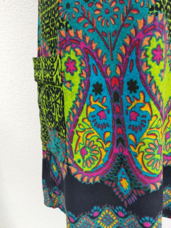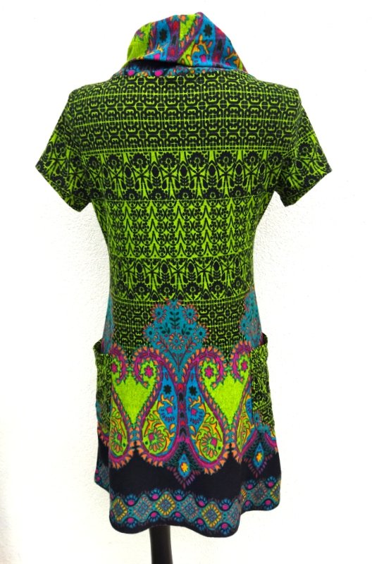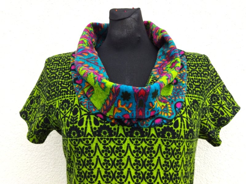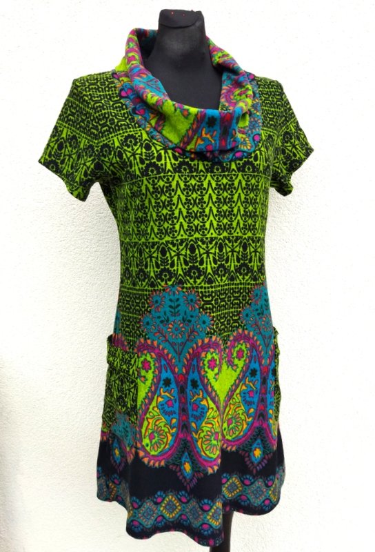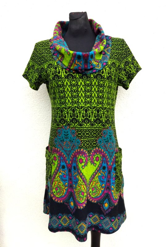 Wzorzysta sukienka z dzianinowej tkaniny w żywej kolorystyce . Wkładana przez głowę - bez zamka. Z dużym luźnym golfem, z dwiema naszywanymi kieszeniami. Miła, podatna i rozciągliwa