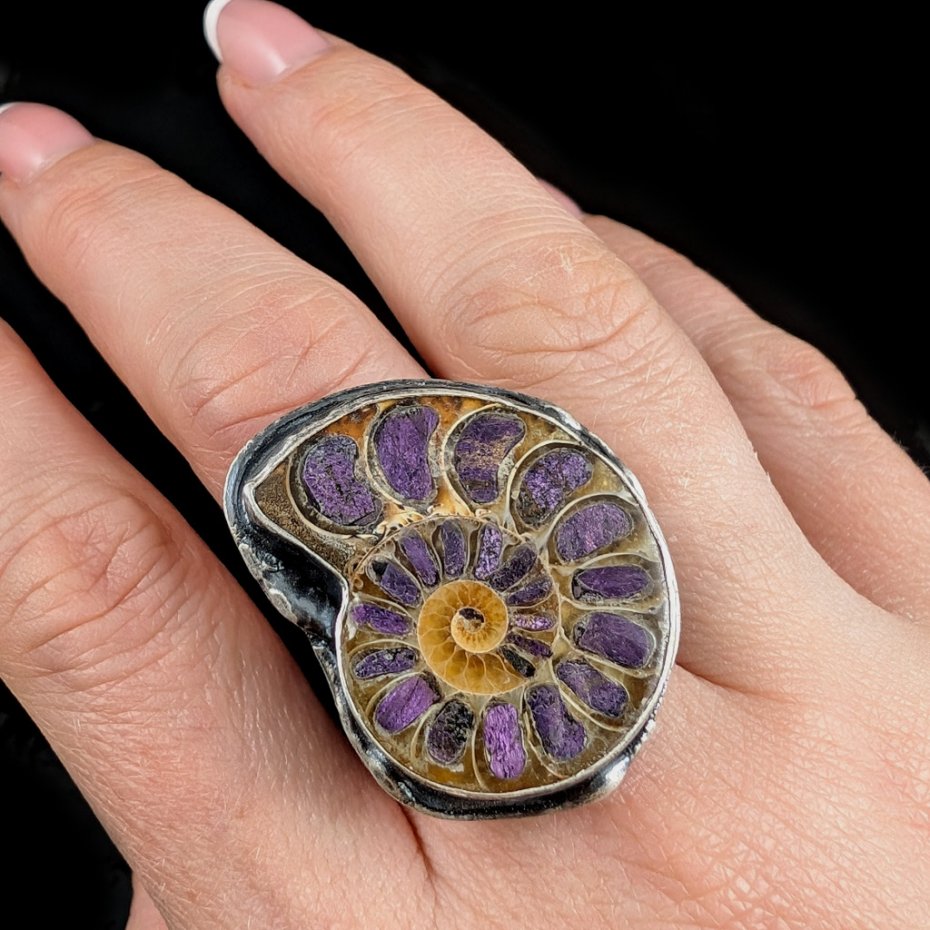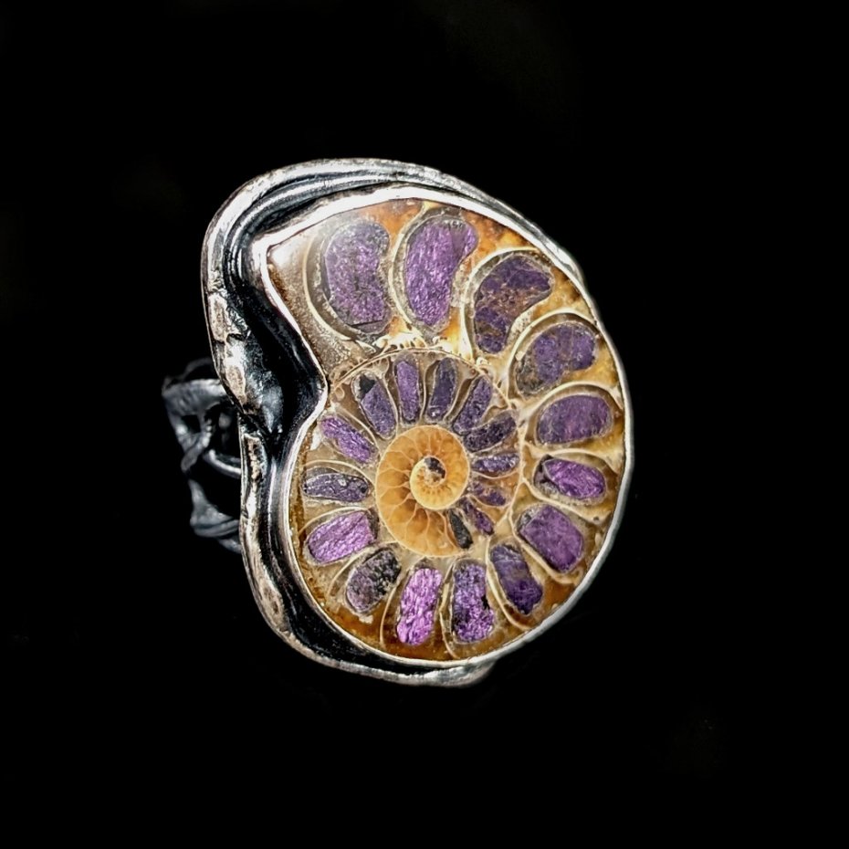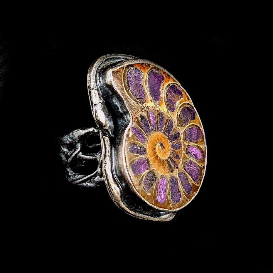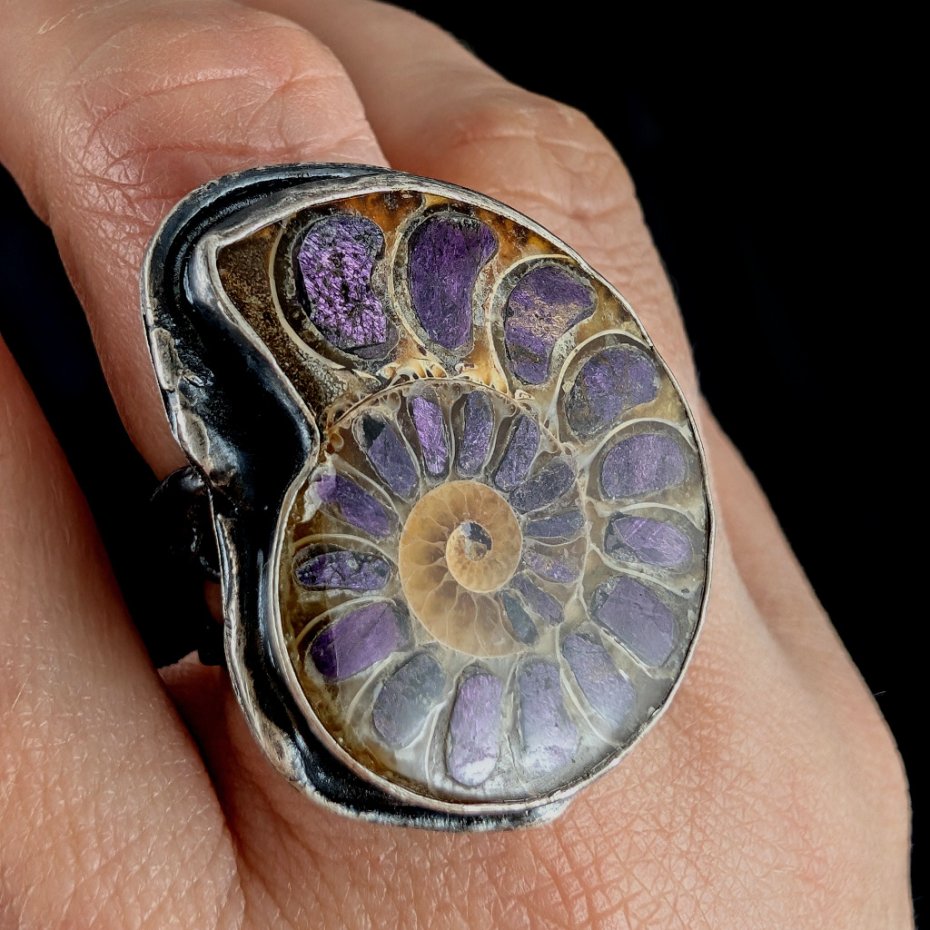 Okazały pierścień z niezwykłym amonitem inkrustowanym fioletowym, połyskliwym purpurytem. Amonit oprawiony został w srebro próby 925, oksydowane. Wymiary oprawy 34 x 28 mm. Rozmiar jubilerski 17, mogę powiększyć do rozmiaru max 18. Waga 17 g. Polecam. Zostanie wyslany w ozdobnym pudełeczku. W galerii znajduje się wisiorek do kompletu.