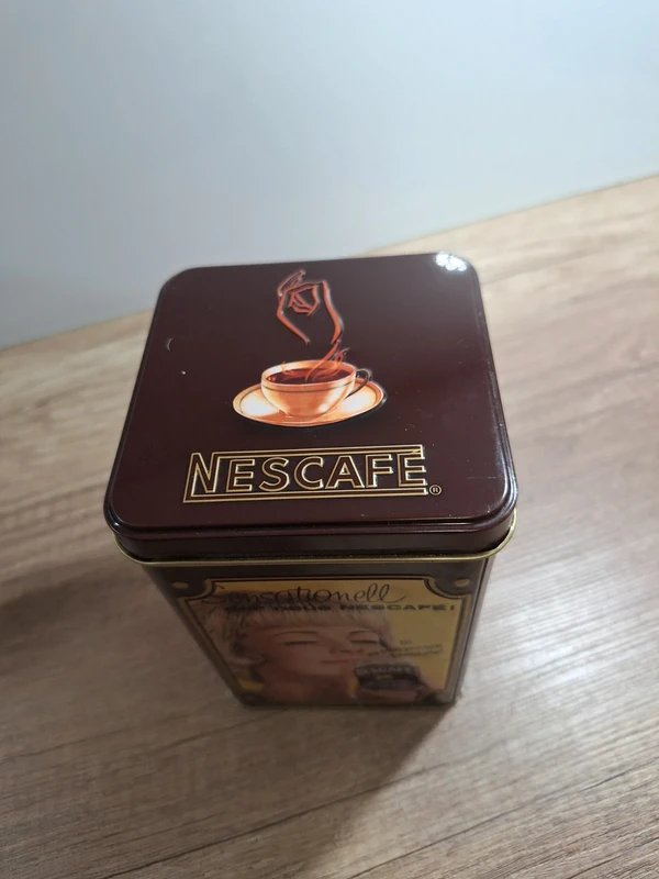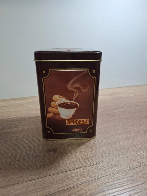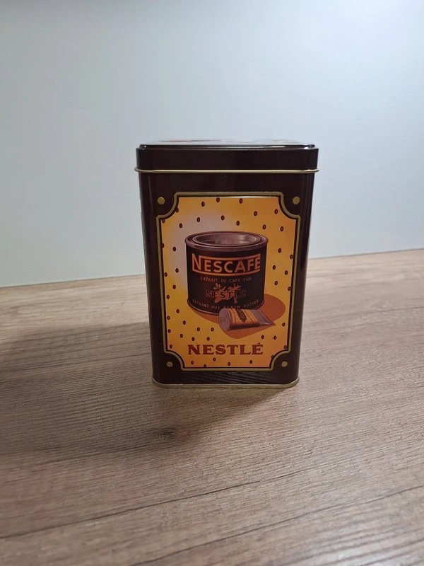 Metalowa puszka kolekcjonerska w stylu vintage z grafiką marki Nescafé. Front zdobi ilustracja klasycznej puszki kawy Nestlé w żółtej ramce z motywem kropek – całość utrzymana w estetyce dawnych reklam.