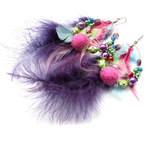 Niezwykle lekkie i puszyste kolczyki wykonane z mieszanki piór: piór kogucich, puszystych piórek marabuta oraz piórek przycinanych. Materiały: piórka, szklane korale, korale spectra, drewniane korale, perły, korale cloisonne, korale filcowe, metalowe przekładki zawieszone na lince jubilerskiej, srebrne bigle. Długość kolczyków bez bigli 16 cm, długość koralików zawieszonych na lince 7 cm. Kolczyki przyciągną każdą uwagę. Paczuszki wysyłam zapakowane w bezpieczny sposób. POLECAM :