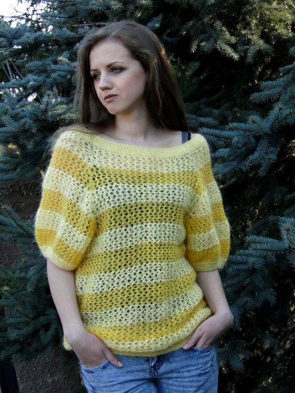 Sweterek wykonany ręcznie na drutach w dwóch odcieniach żółtego: pastelowy i słoneczny ( moher, wełna, akryl). Ażurowy, lekki, miękki i nie gryzie. Można nosić go na top lub długi rękaw w zależności od potrzeb, czy fantazji właściciela. Długość - 80 cm, szerokość- 51 cm, dł. rękawa od krawędzi dekoltu - 35 cm. Rozmiar: S-M. Serdecznie polecam.